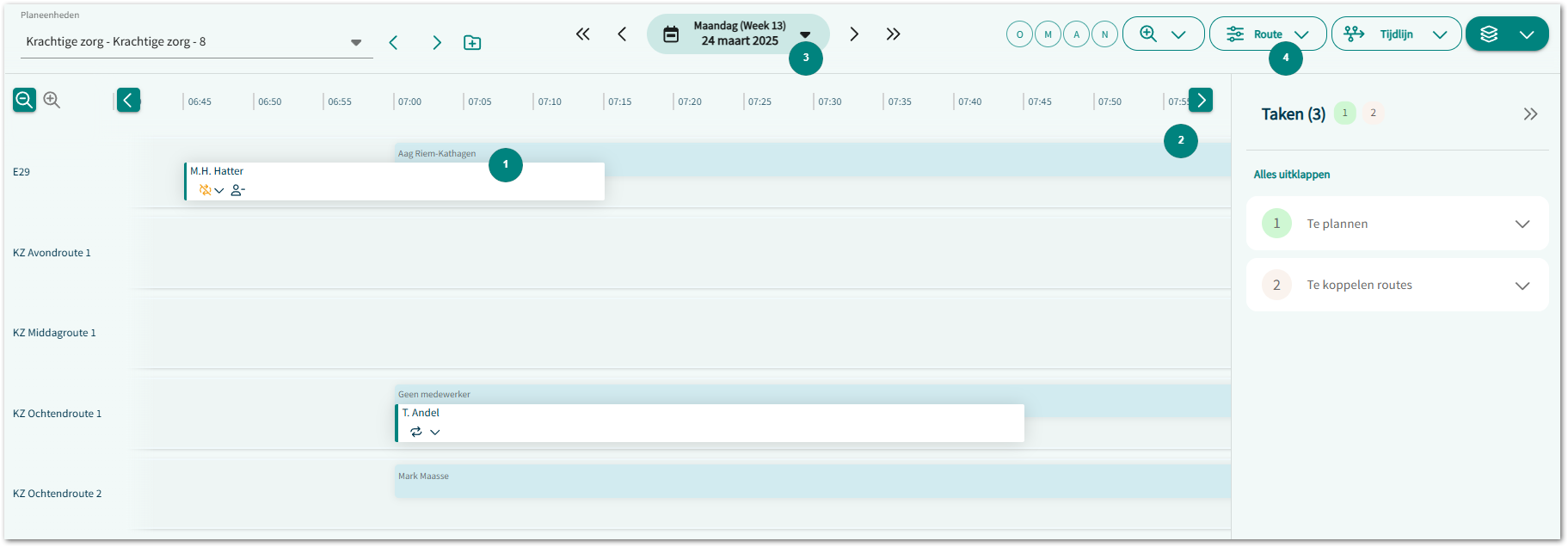 - Routes zijn hier zichtbaar als blauwe balkjes, waarop afspraken kunnen worden ingepland