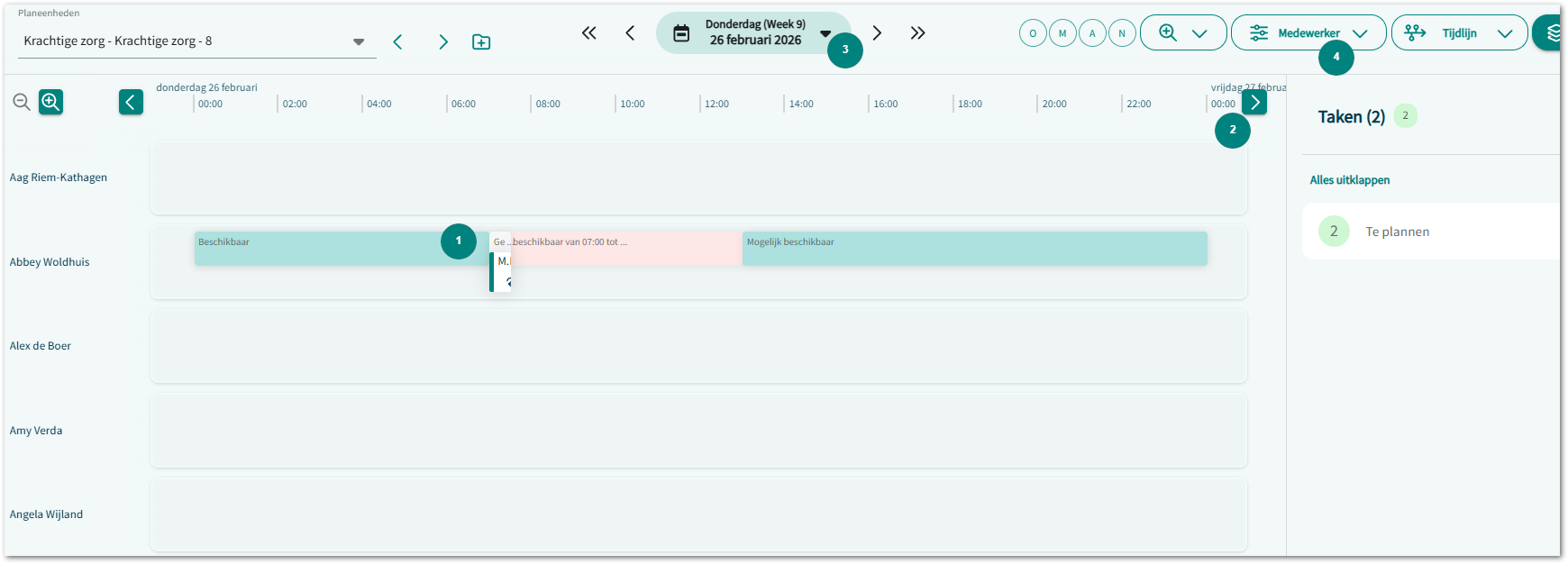Medewerker beschikbaarheden worden getoond met een groene of rode kleur - Schuif de tijdlijn met deze knoppen naar een eerder of later tijdstip. Dit kan ook door het scherm te slepen