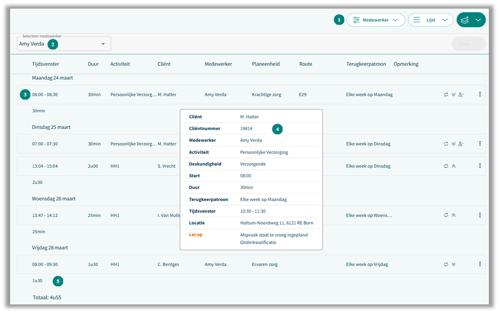 - Toont alle afspraken per medewerker of cliënt in een lijst