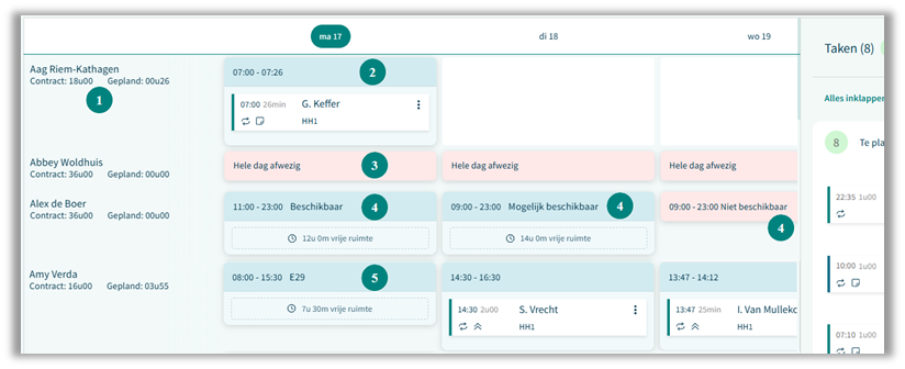 - Opgegeven beschikbaarheden door de medewerker worden hier getoond