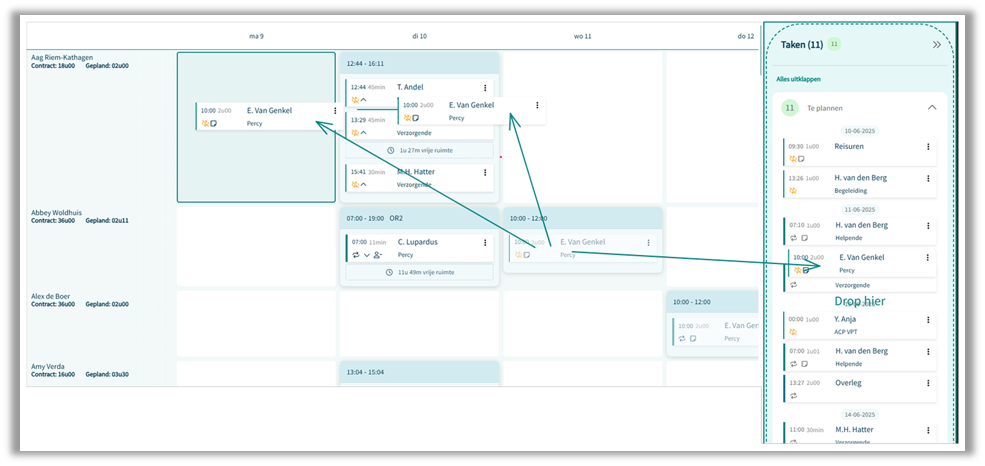 Dit kan van elke plek, naar elke plek. Dus ook tussen verschillende medewerkers, van de takenlijst naar een medewerker en van de medewerker naar de takenlijst.