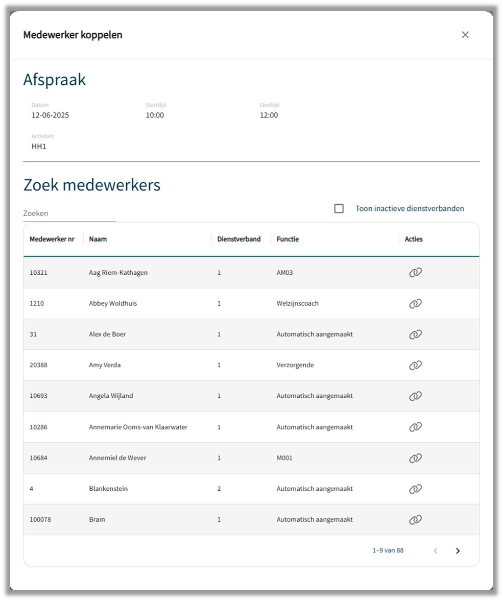 Via het koppelicoon in de kolom Acties kan de betreffende medewerker worden gekoppeld.