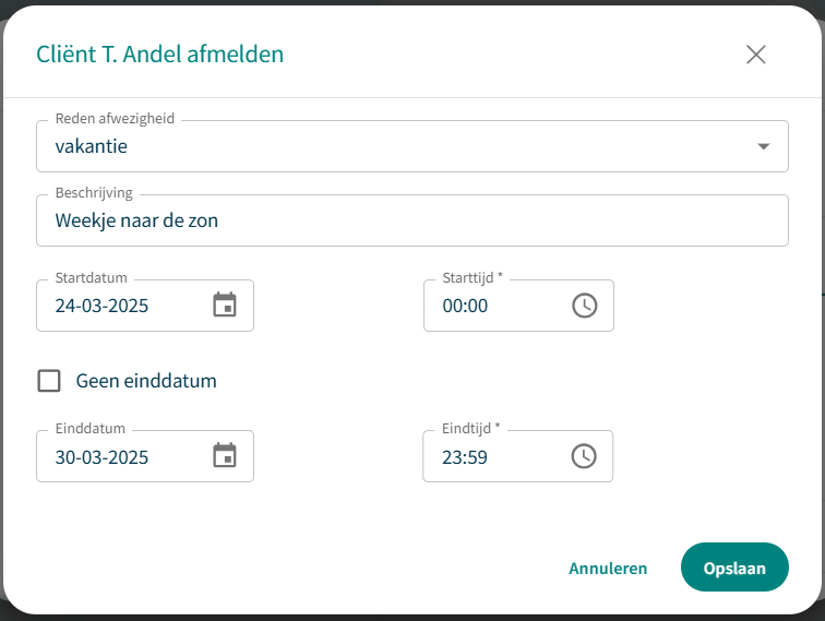 - Leg een afwezigheidsperiode vast voor alleen deze of alle afspraken van de cliënt (zie kopje Afwezigheid periodes beheren)