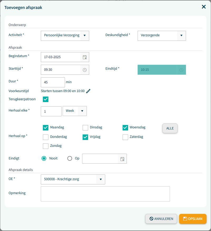 - Vinkje aan → Selecteer om de hoeveel weken de afspraak herhaald dient te worden en op welke dagen