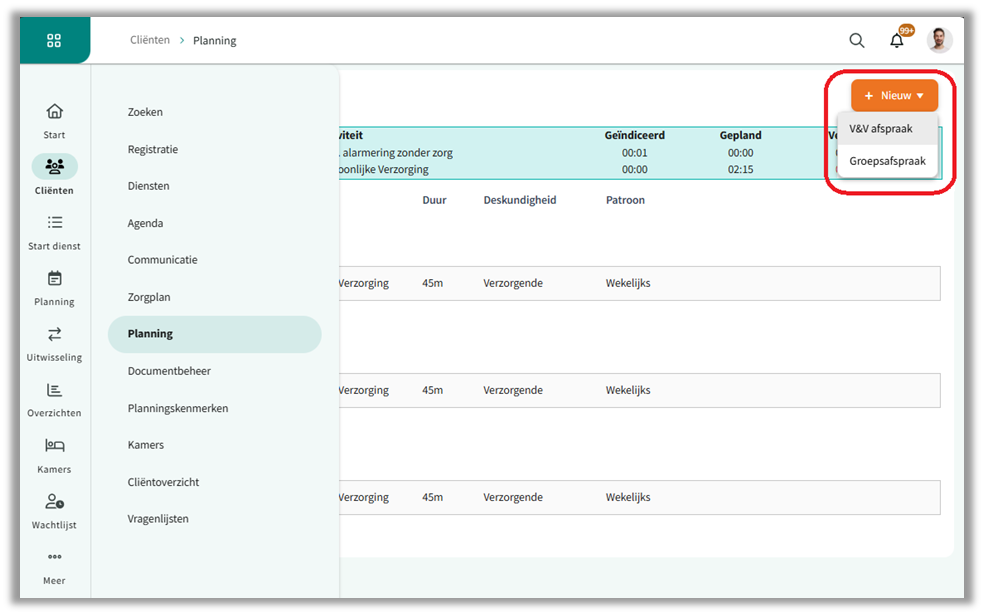 Vanuit het ECD wordt er een basisplanning gemaakt. Zoek een cliënt op en ga vervolgens naar Cliënten - Planning en kies rechtsboven bij +Nieuw voor V&V afspraak.