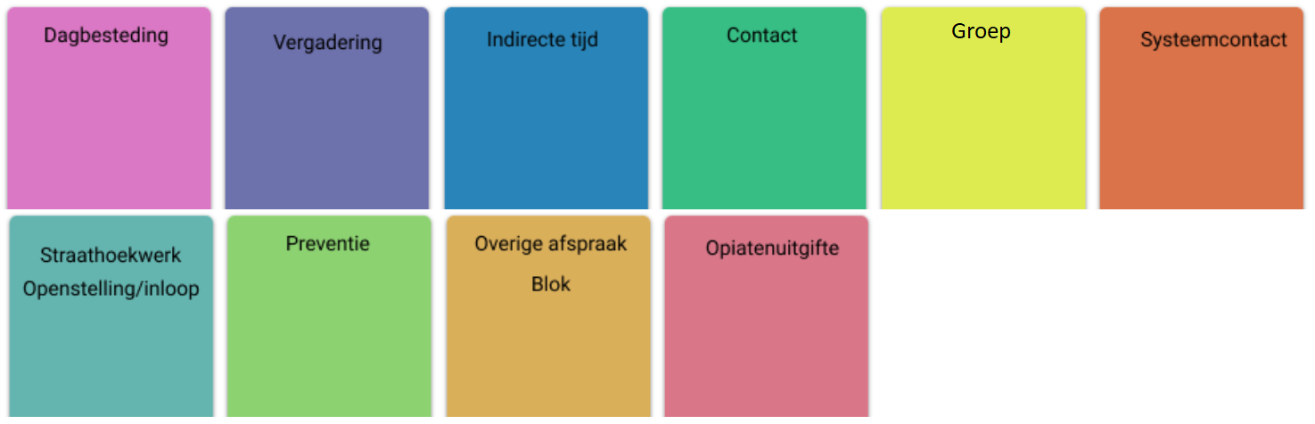 De kleuren van afspraken in de Agenda in het snelmenu zijn zoals hieronder weergegeven. De uitzondering is dat wanneer een afspraak geregistreerd is, dat dan de kleur gewijzigd wordt naar dezelfde kleur als die van de tab bovenaan het snelmenu: