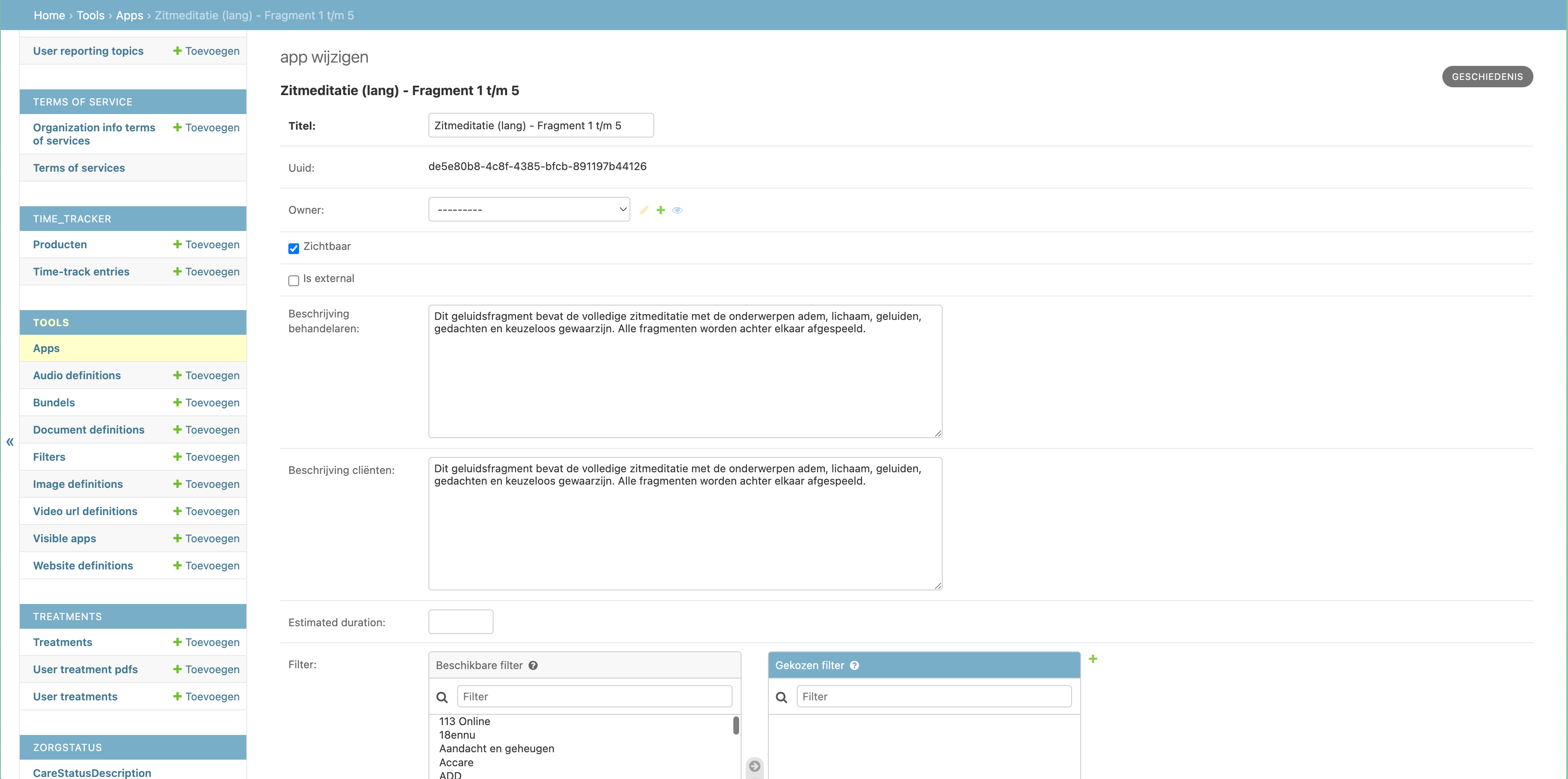 Het is ook mogelijk om filters toe te voegen zodat het hulpmiddel vanuit de hulpmiddelenbibliotheek makkelijker te vinden is. Bij het hulpmiddel 'zitmeditatie' zou je voor de filter 'meditatie' kunnen kiezen bijvoorbeeld.