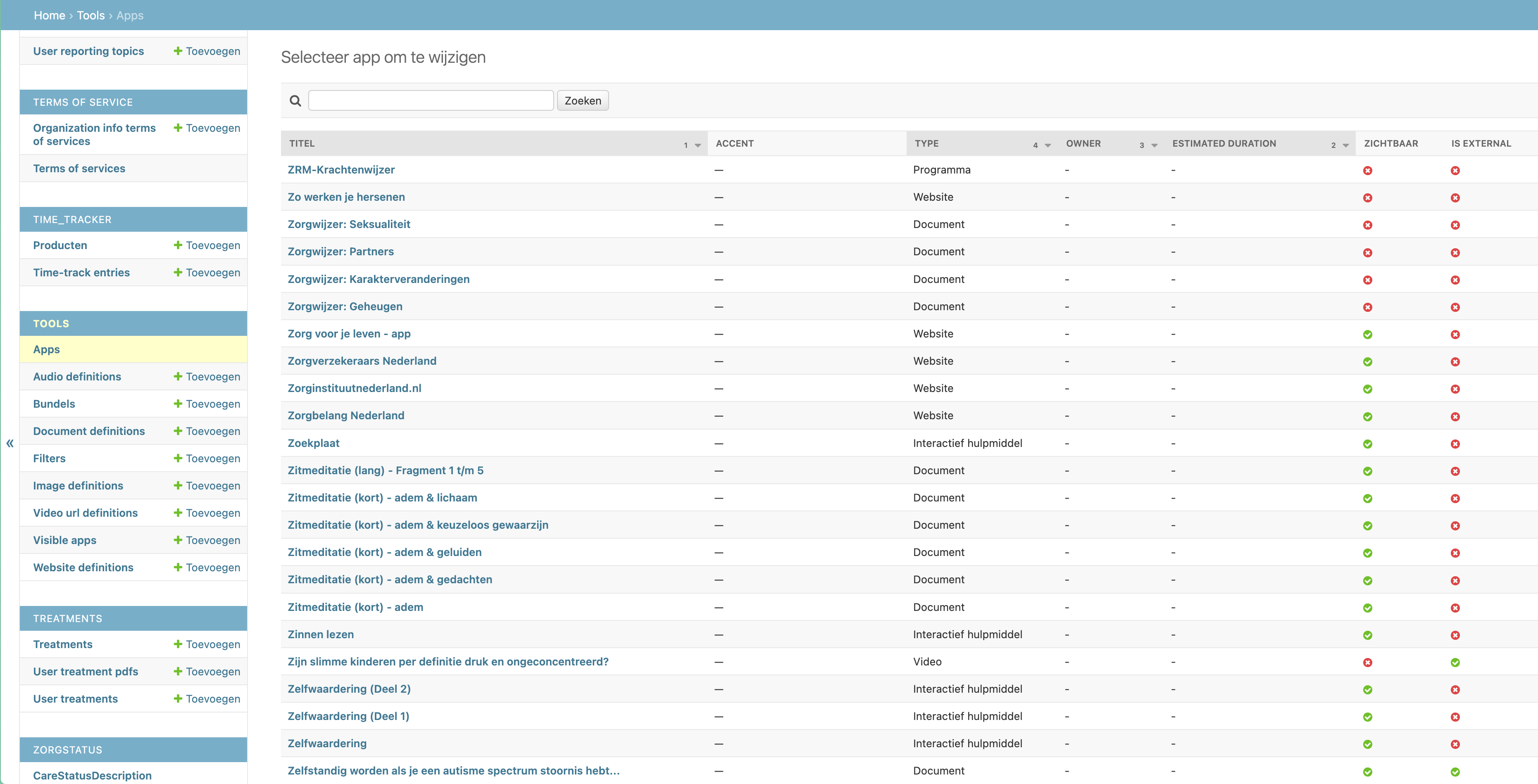 Op bovenstaande pagina zijn alle apps te vinden. Je kan op 'titel' klikken om de volgorde te veranderen en je kan ook zien of dit hulpmiddel is ingesteld als 'zichtbaar'.