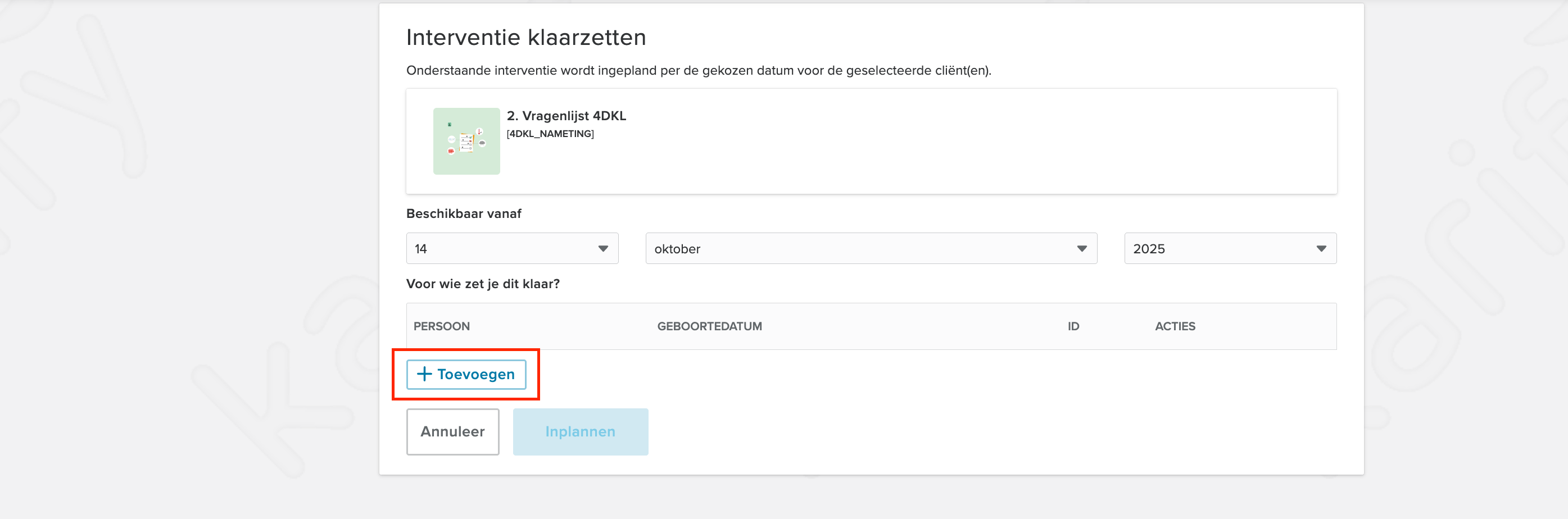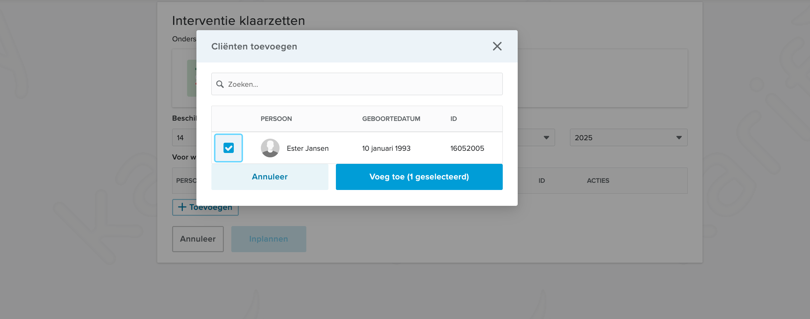 Het is mogelijk om zowel als behandelaar en/of assistent om de interventie voor meer dan één cliënt klaar te zetten.