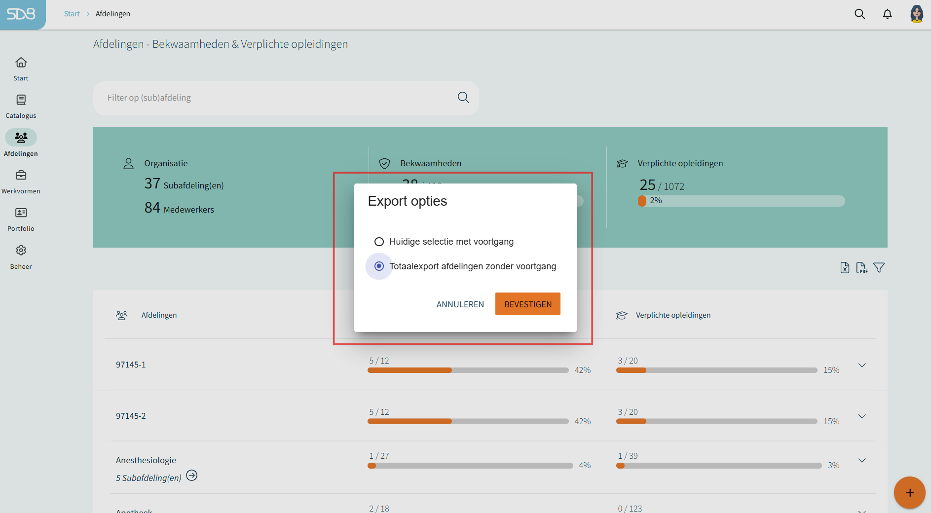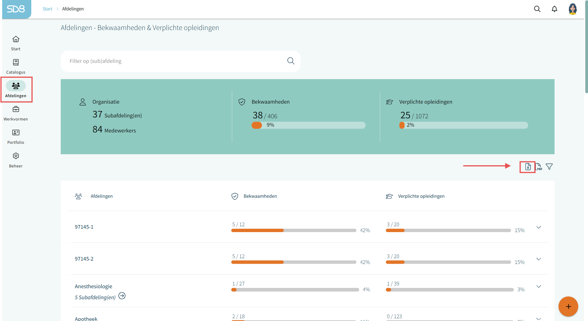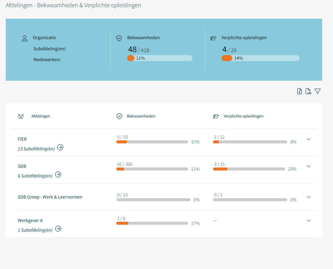 Je ziet per afdeling de status van de afdeling m.b.t. bekwaamheden en verplichte opleidingen. Een afdelingshoofd/manager ziet dezelfde informatie, maar alleen van de 'eigen' afdeling(en).