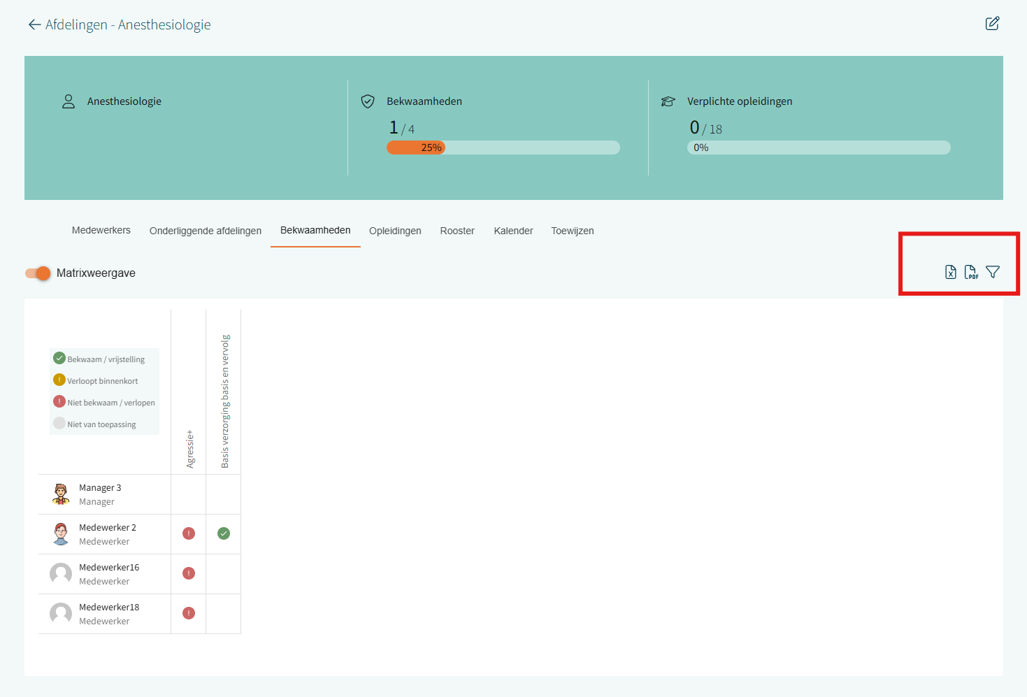 Deze rapportage is te downloaden als PDF en Excel bestand. Ga naar betreffende afdeling en kies dan voor bekwaamheden om zo bij de gewenste pagina te komen.