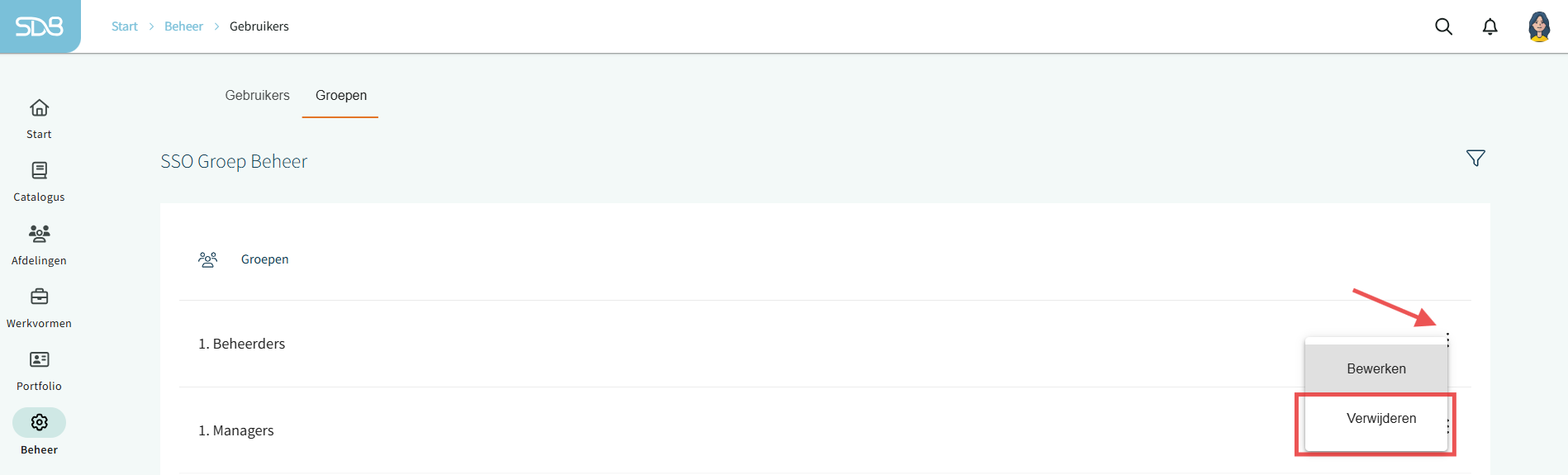 Mocht je een hele groep willen verwijderen, dan klik je op de drie puntjes achter de groep en kies je de optie verwijderen.