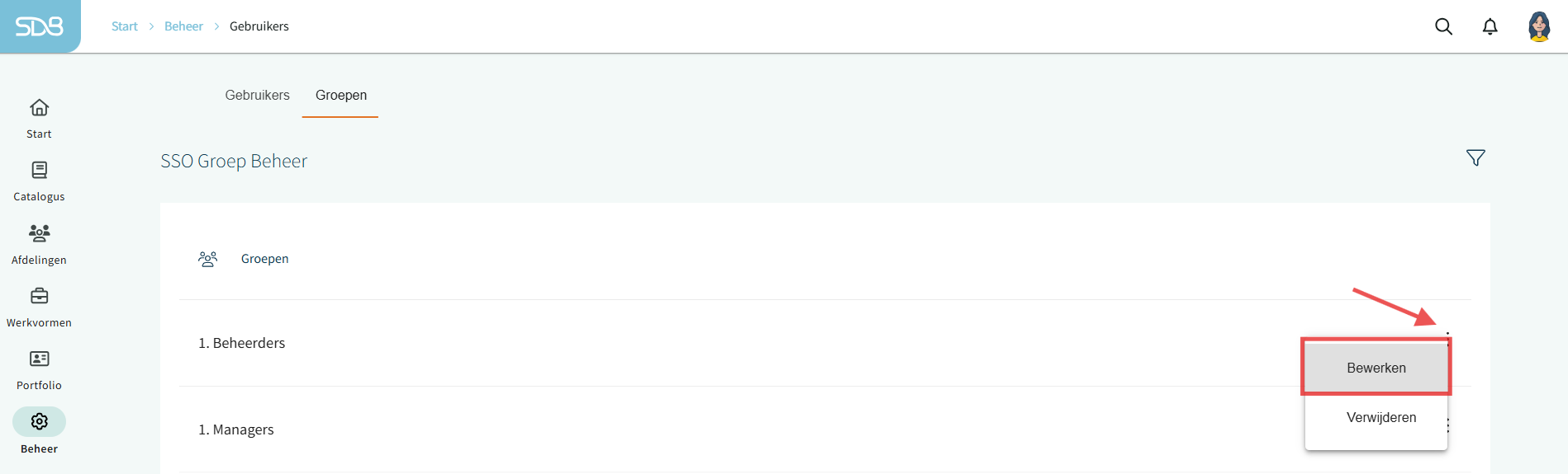 Mocht een medewerker uit dienst gaan of om wat voor reden dan ook de rol van beheerder niet meer nodig hebben, dan kun je die gebruiker uit de groep verwijderen door weer naar Beheer> Gebruikers te gaan. Klik op de drie puntjes achter de groep om hem te bewerken.