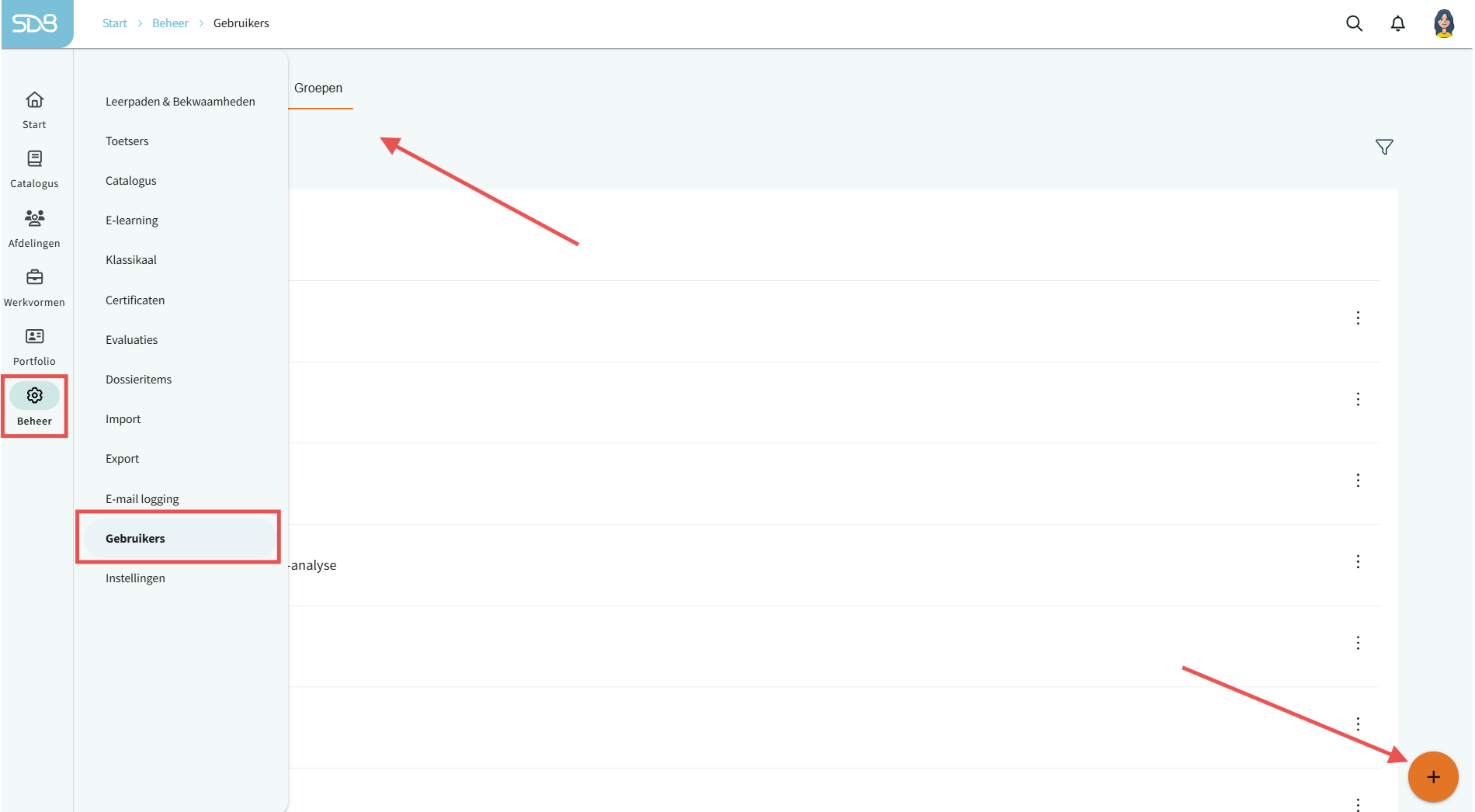 Om meerdere gebruikers in één keer toe te voegen als beheerder, kun je een groep aanmaken. Ga hiervoor naar Beheer > Gebruikers en klik op de tab Groepen en daarna op de plusknop rechtsonderin.