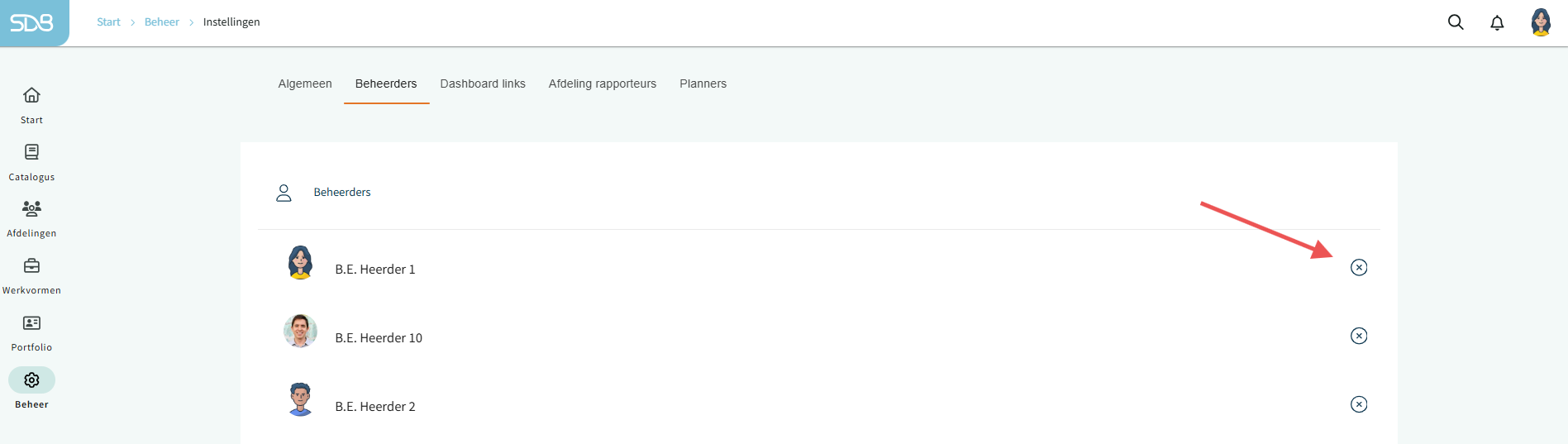 Mocht een medewerker uit dienst gaan of om wat voor reden dan ook de rol van beheerder niet meer nodig hebben, dan kun je die gebruiker weer uit de lijst verwijderen door op het kruisje achter de naam te klikken.