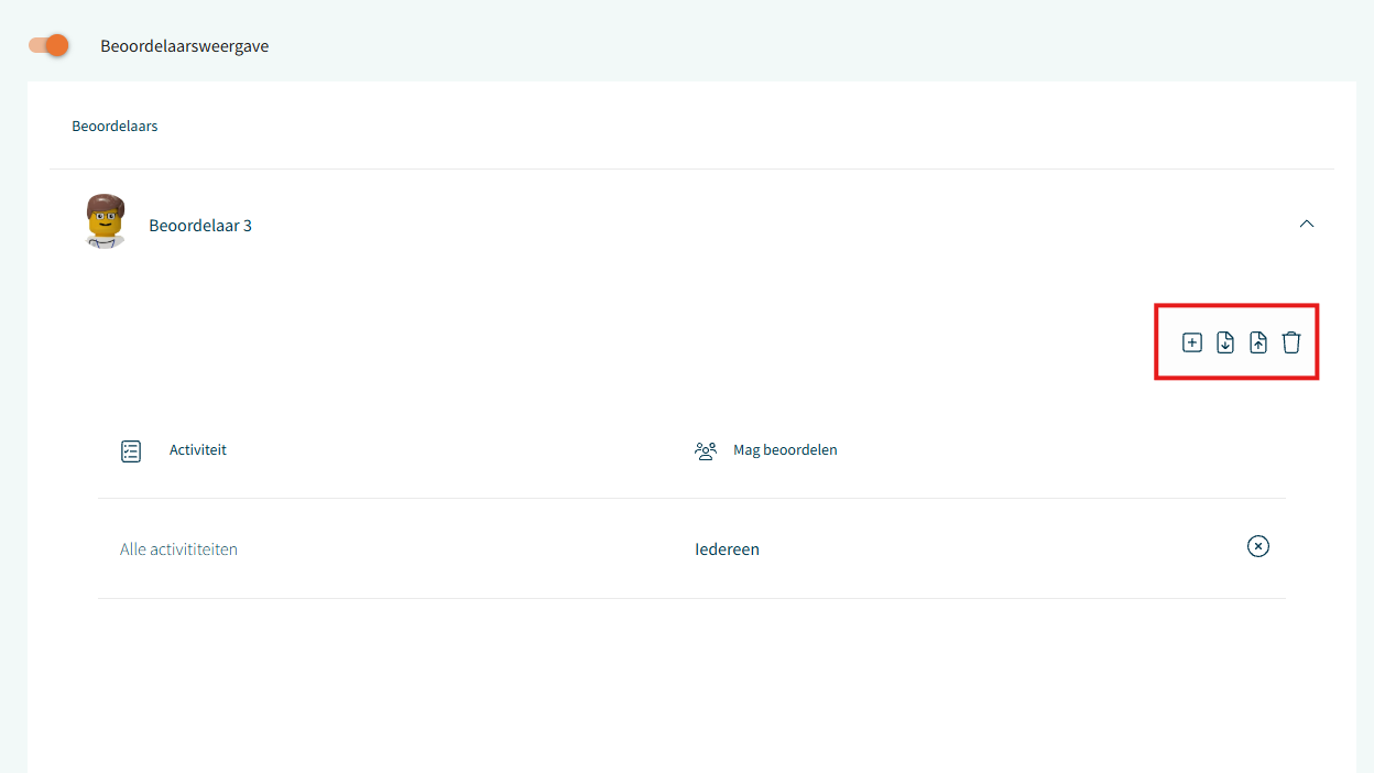 In Beoordelaarsbeheer wordt standaard de Beoordelaarsweergave getoond. Hier zie je alle toetsactiviteiten die aan de beoordelaar zijn toegewezen binnen de bekwaamheid. Wanneer de toggle wordt uitgeschakeld, worden in plaats daarvan alle activiteiten weergegeven die aan de beoordelaar zijn toegewezen.