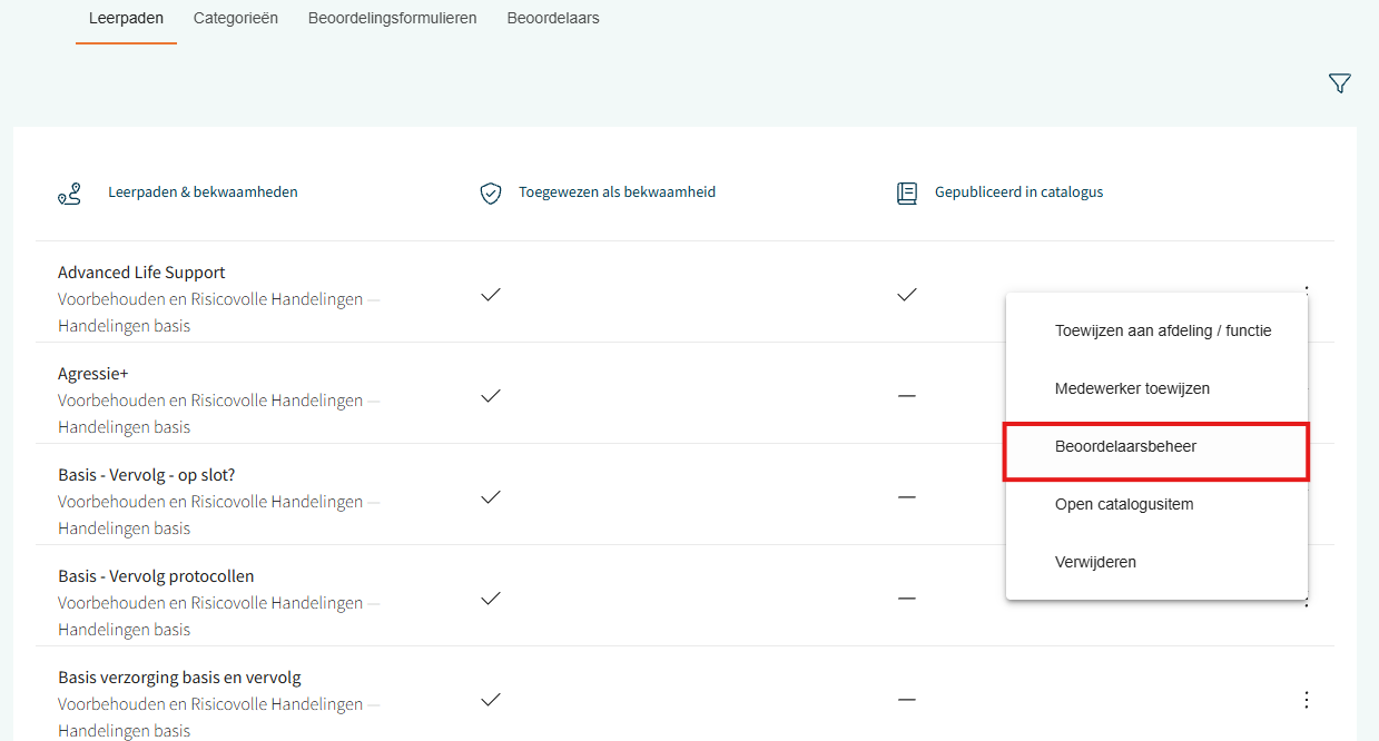 In Beheer > Bekwaamheden kun je via het tabblad Bekwaamheden en het tabblad Beoordelaars bestaande of nieuwe toewijzingen koppelen aan zowel nieuwe als bestaande beoordelaars. Via de bekwaamheid kun de beoordelaar toekennen door te klikken op de drie puntjes > Beoordelaarsbeheer.