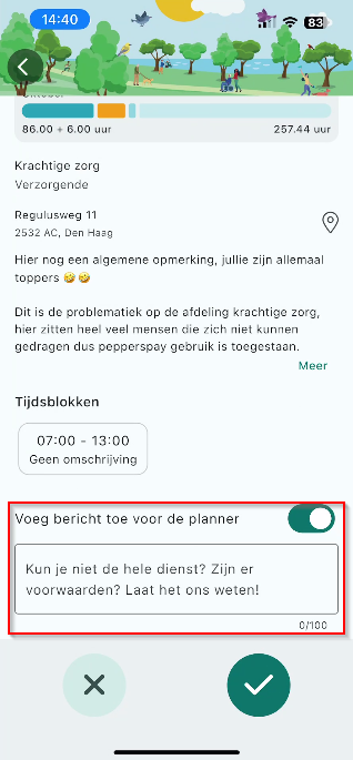 Bij sommige diensten kun je door middel van een schuif een bericht toevoegen voor een planner. De planner kan deze reacties in SDB Planning bekijken.