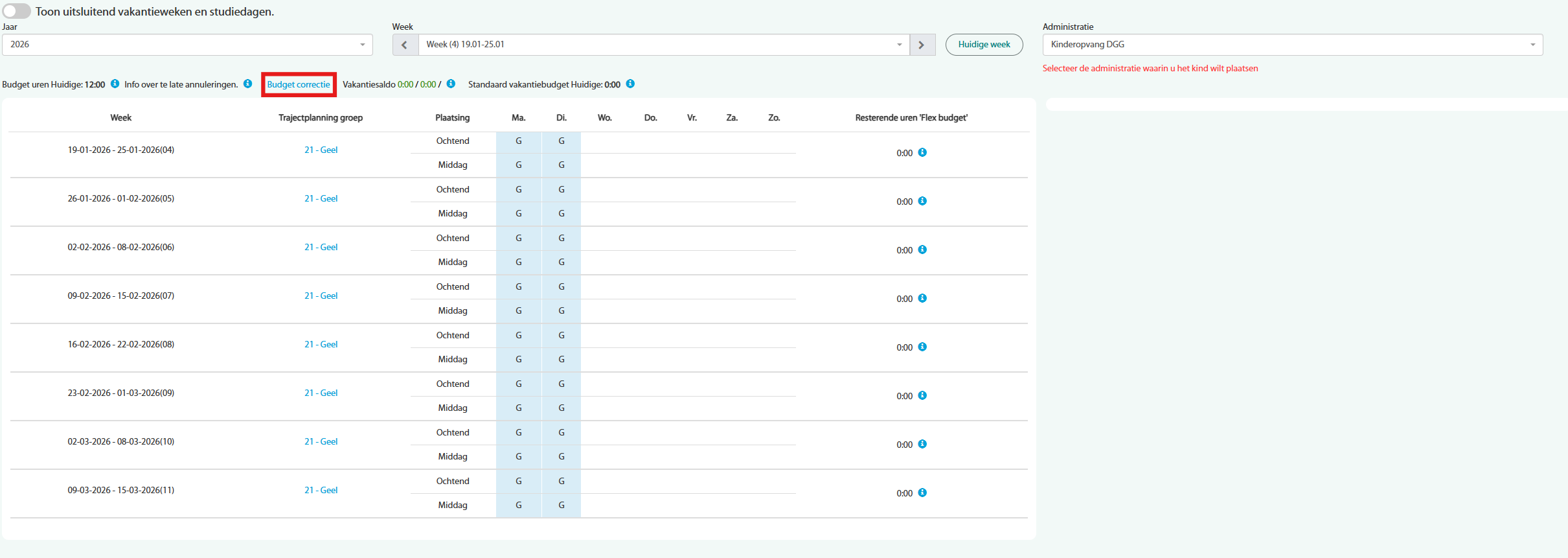 Ga naar Gezinnen > kies een kind en klik op de [Weekplanning] vervolgens klik je op het blauw weergegeven [Budget correctie] om een correctie toe te voeren.