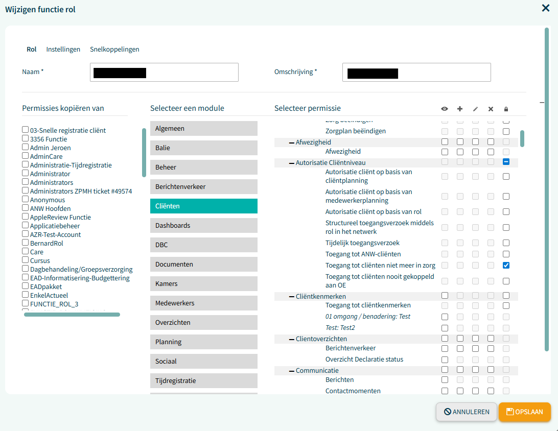 Als in de functionele rol de permissie toegekend ' toegang tot cliënten niet meer in zorg':
