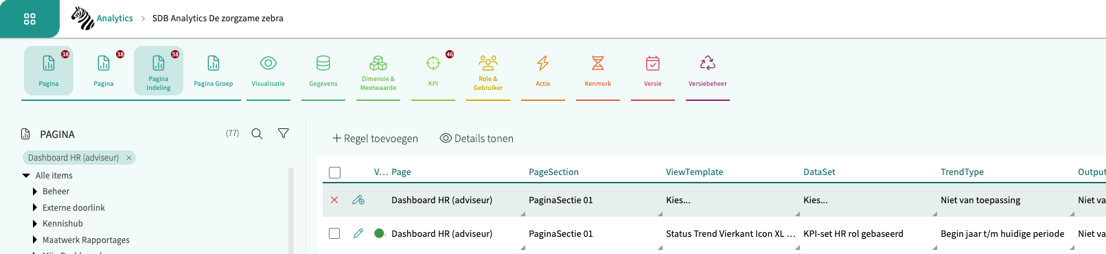 Aan de achterkant ziet dat er als volgt uit (Pagina > Pagina Indeling met een selectie in de Pagina slicer op "Dashboard (HR) adviseur" in dit voorbeeld):
