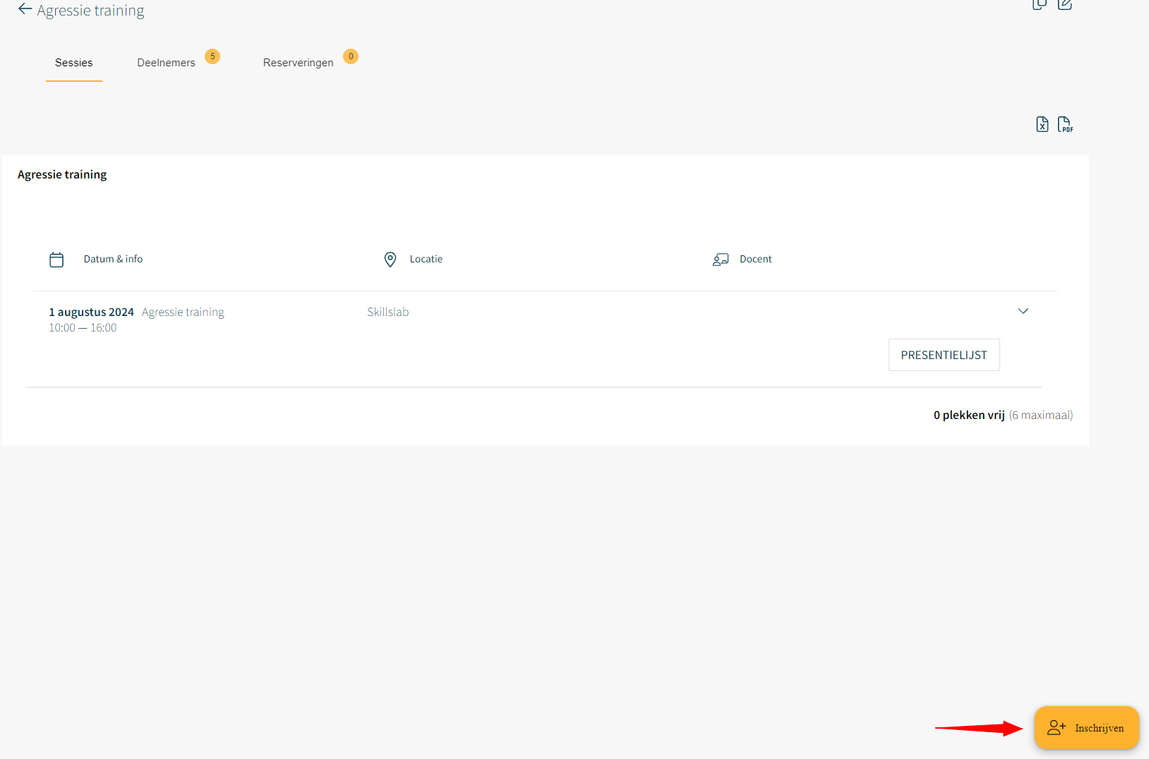 Klik op op de button Inschrijven rechtsonder om deelnemers toe te voegen aan de gekozen sessie.