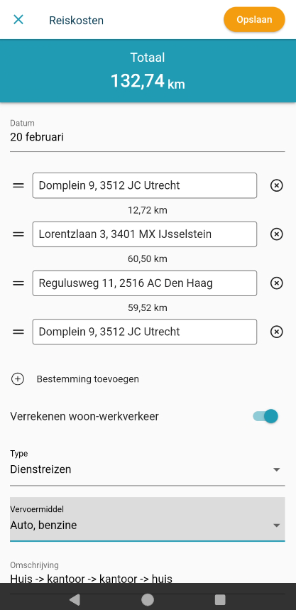Vergeet je vervoermiddel niet te corrigeren indien nodig. Verder is een omschrijving / opmerking verplicht.