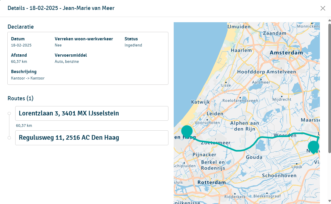 Bekijk hier de afstand, ingevulde adressen, de route weergeven op de kaart en andere details.