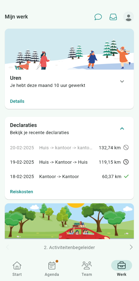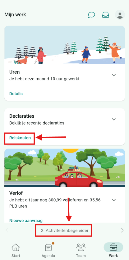 Ga naar de Werk-pagina, kies onderin je dienstverband en druk Reiskosten.