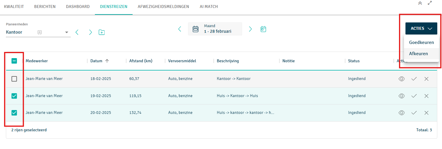 Aan de linkerkant zijn meerdere declaraties tegelijk te selecteren. Deze kunnen allemaal in één keer worden goed- of afgekeurd met de blauwe actiesknop rechtsbovenin