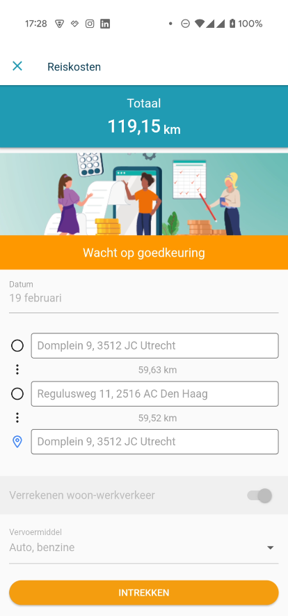 Afhankelijk van de instellingen van je organisatie, kunnen woon-werk kilometers tegelijk worden gedeclareerd.
