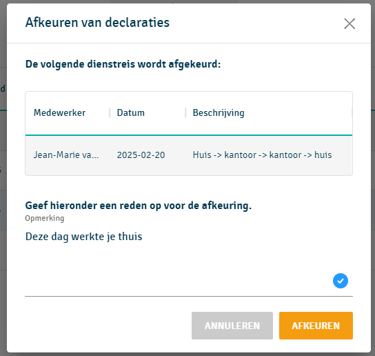 Bij het afkeuren van een declaratie, dient er een opmerking met rede gegeven te worden.