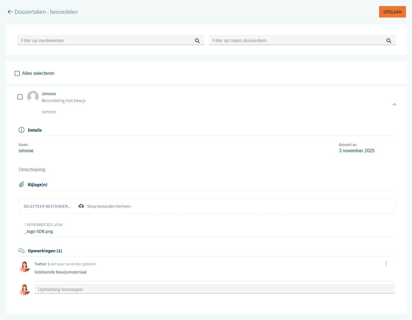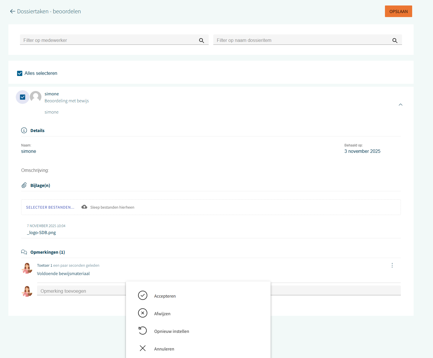 Selecteer één of meerdere medewerkers om een aanvraag te beoordelen. Er opent een actiemenu waarin je kunt kiezen voor Goedkeuren of Afwijzen. Klik op Opslaan om de keuze te verwerken. Hiermee worden dossieritems eenduidig en volledig afgehandeld.