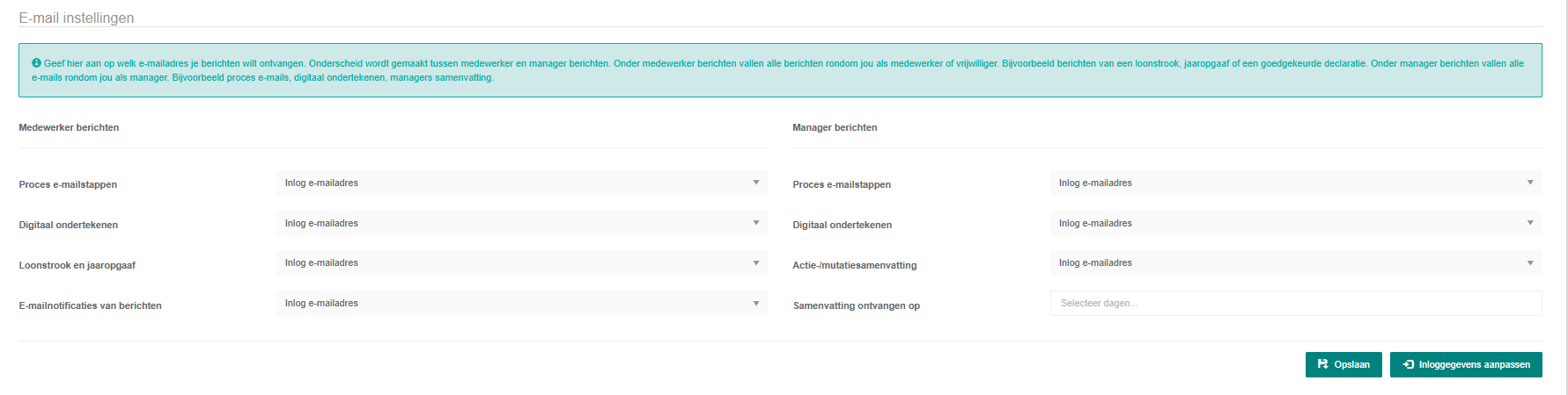 Geef hier aan op welk e-mailadres je welke berichten wilt ontvangen. Er wordt onderscheid gemaakt tussen medewerker berichten en manager berichten. Onder medewerker berichten vallen alle berichten rondom jou als medewerker of vrijwilliger.