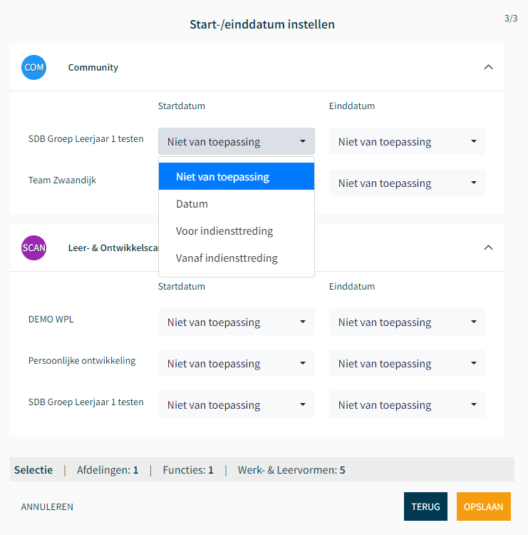 In deze stap kun je per werk-& leervorm een start en/of einddatum instellen, zodat de gebruiker in een bepaalde periode toegang heeft. Je kunt via de selectie menu aangeven of een start of einddatum niet van toepassing, een specifieke datum heeft, voor een indiensttreding of vanaf een indiensttreding. Als Niet van toepassing is geselecteerd zal de werk-& leervorm altijd gekoppeld zijn aan de gebruiker.