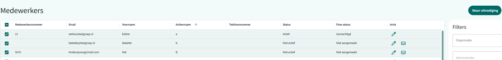 Wanneer een medewerker op 'Inactief' stond dan zal dit na het versturen van een uitnodiging automatisch veranderen in 'Actief'.