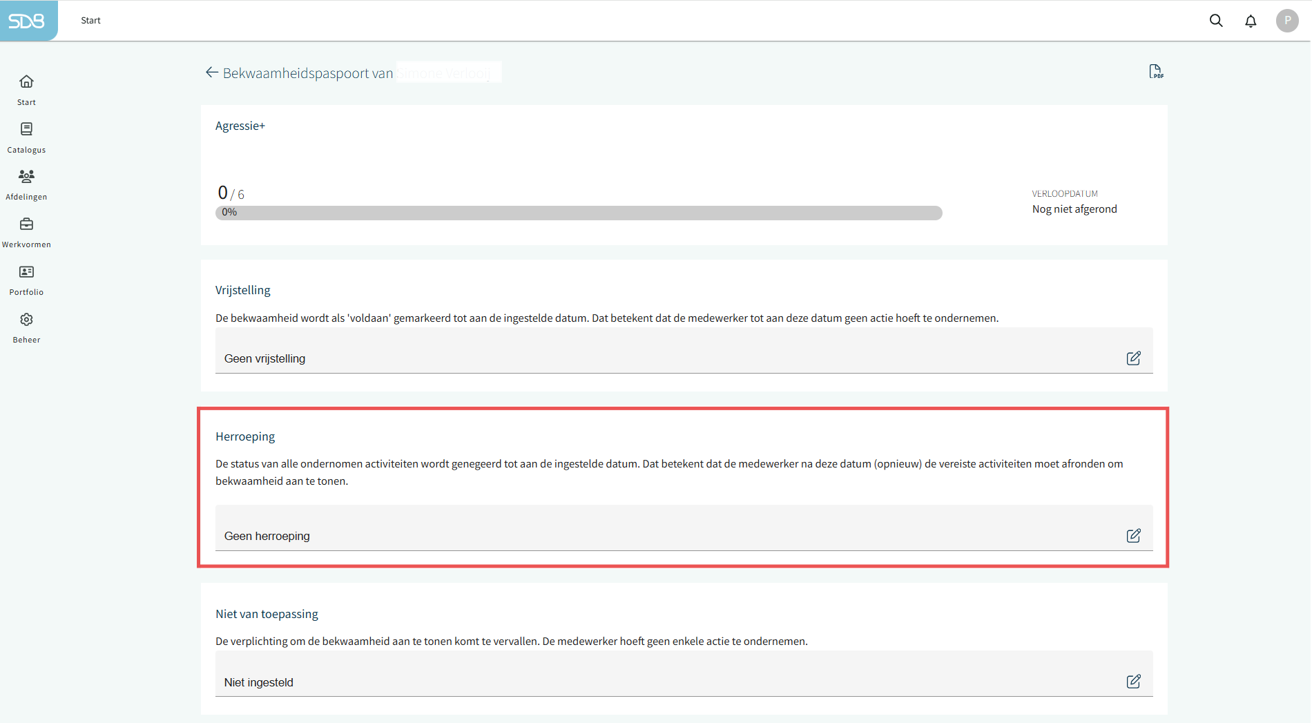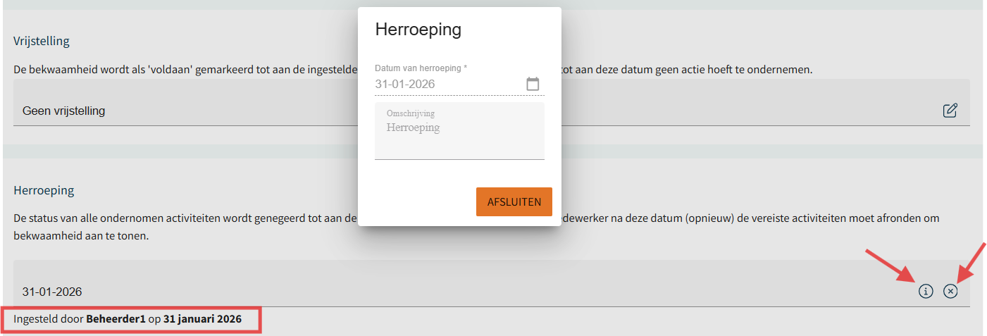 Een afgeronde bekwaamheid kan volledig worden herroepen als beheerder. Bij het invoeren van een herroepingsdatum met eventueel een opmerking worden alle gekoppelde activiteiten automatisch heropend. Indien gewenst kan de herroeping ook eenvoudig ongedaan worden gemaakt.