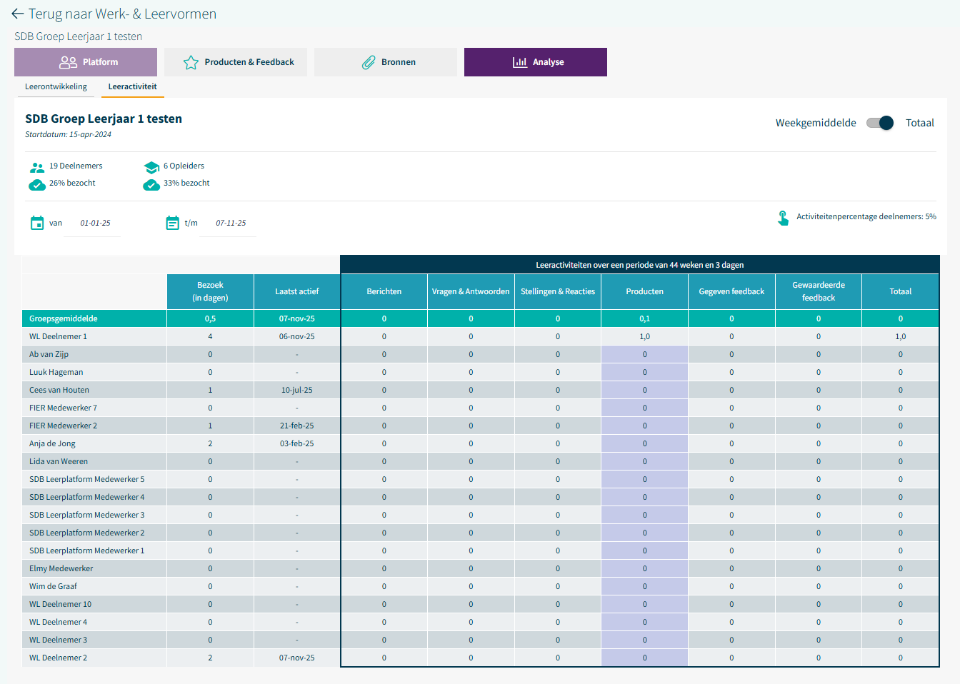 In het Leeractiviteit-overzicht krijg je snel inzicht in wat er binnen je groep gebeurt en kun je resultaten filteren op periode en weergave.