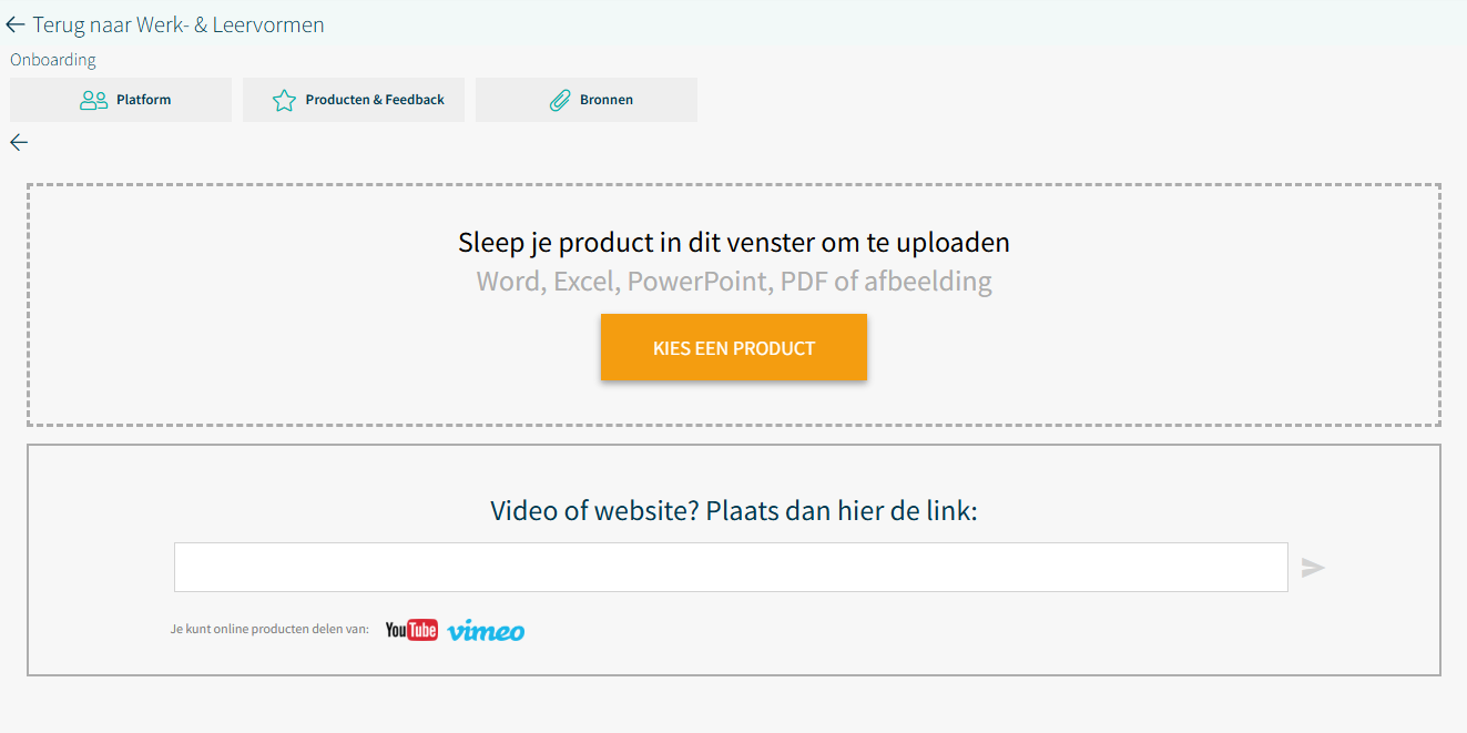 - Via 'Kies product' kun je een document uploaden of je kunt een link invoeren (video of website).
