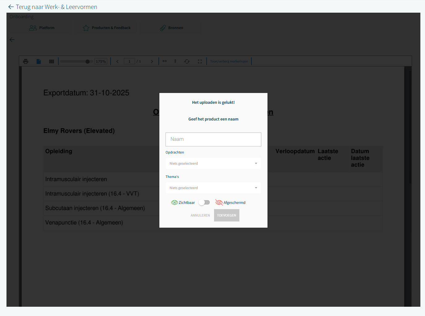 Binnen Productbeheer kan per community worden ingesteld dat uploads standaard afgeschermd zijn. Dit betekent dat documenten uitsluitend zichtbaar zijn voor opleiders, experts en gekoppelde coaches. Deelnemers kunnen de bestanden niet openen en kunnen ...