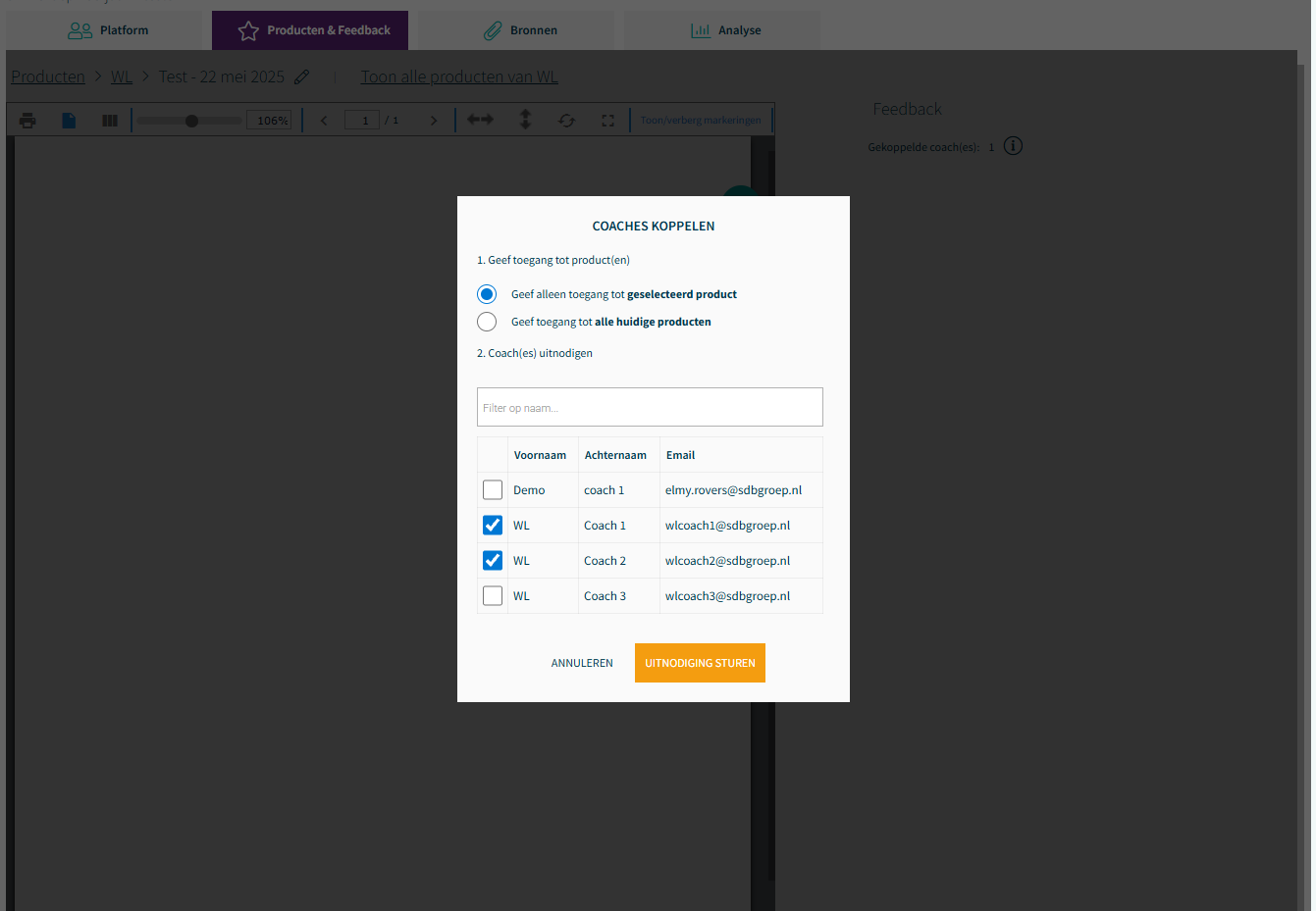 Selecteer de gewenste coach(es) uit de lijst en klik tot slot op ‘Coaches (ont)koppelen’ om de geselecteerde coaches per direct toegang te geven tot hun product.