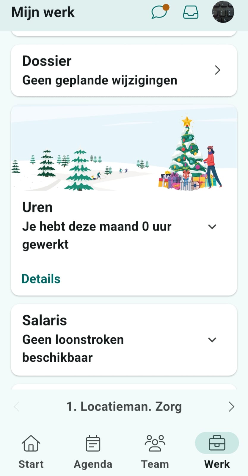 Nu staat in het tabje "Werk" het "Dossier" van HR met de opties Personalia, Documenten, Contract en Rekeningen.