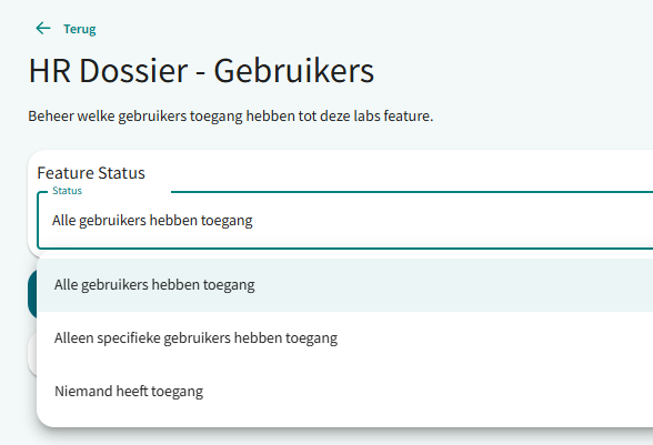 Bij de optie "HR Dossier" kun je 3 acties kiezen: alle gebruikers hebben toegang, alleen specifieke gebruikers of niemand heeft toegang.