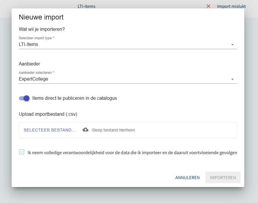 Bij het importeren van een nieuw bestand kan gekozen worden voor het type 'LTI-items' en de aanbieder 'ExpertCollege'. Daarmee kunnen ExpertCollege e-learnings in bulk worden geïmporteerd door gebruik te maken van het juiste (door ExpertCollege aangeleverde) format.