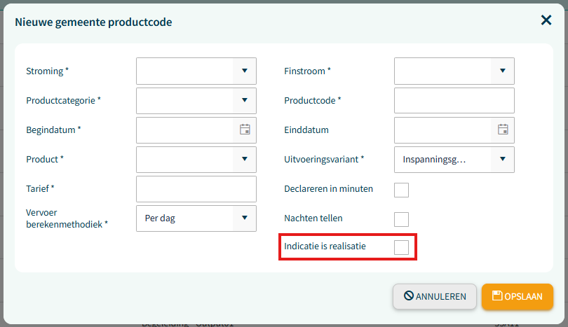 In het stambestand "Gemeente productcodes" is het mogelijk om de optie “Indicatie is realisatie” te activeren voor de uitvoeringsvariant "Inspanningsgericht".