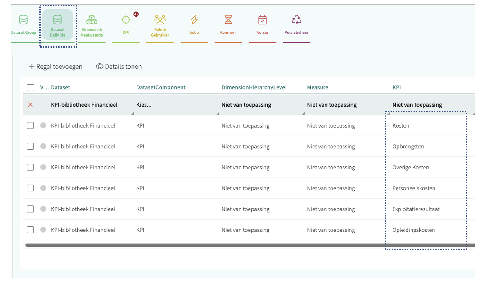 - DataSet definitie vullen met KPI's: in de topnavigatie van je Model Gebruiker rol vind je "KPI" > "KPI". Hier zie je in de slicer thema's staan en in de tabel zie je de KPI's die nu bestaan in de InTouch omgeving. Via "Gegevens" > "DataSet Definitie" voeg je een KPI toe aan een set.