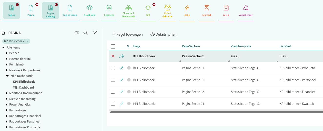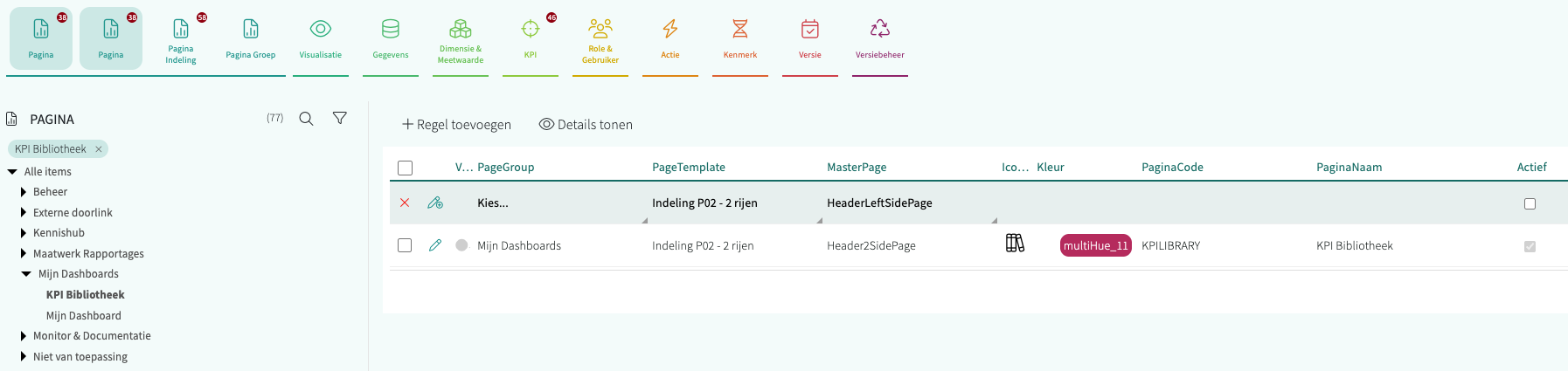 Een Pagina: in de Pagina Groep "Mijn Dashboards" vind je de pagina "KPI Bibliotheek" met de code "KPILIBRARY":