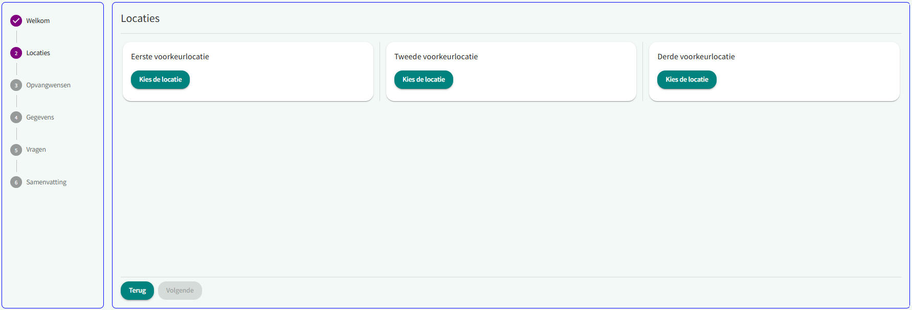 Door op 'Kies de locatie' te klikken bij de eerste voorkeurs locatie kan de eerste voorkeur worden opgegeven.