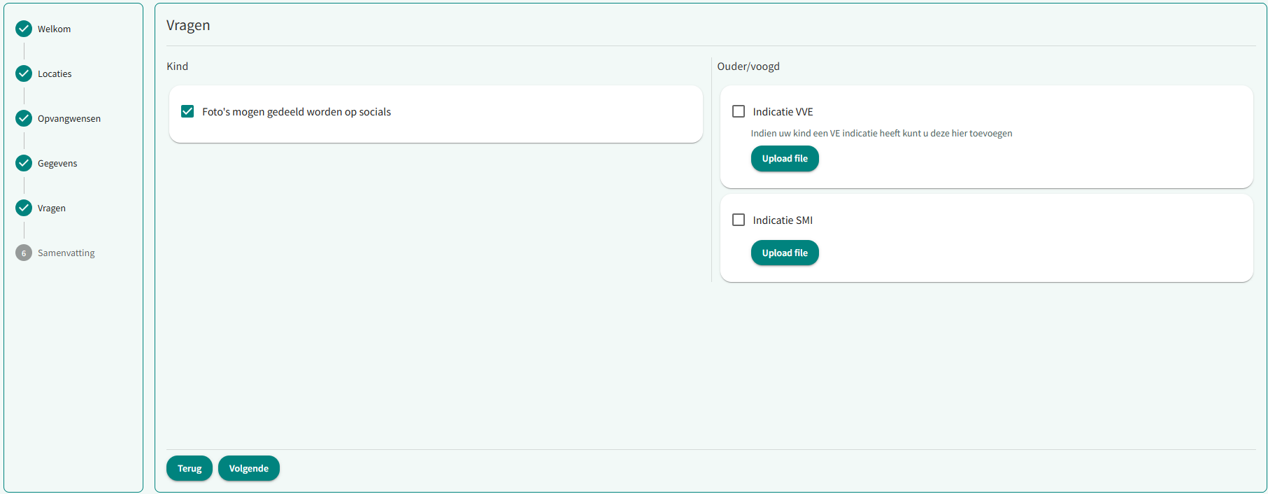 De pagina Vragen kan worden gebruikt om nog extra informatie op te vragen.