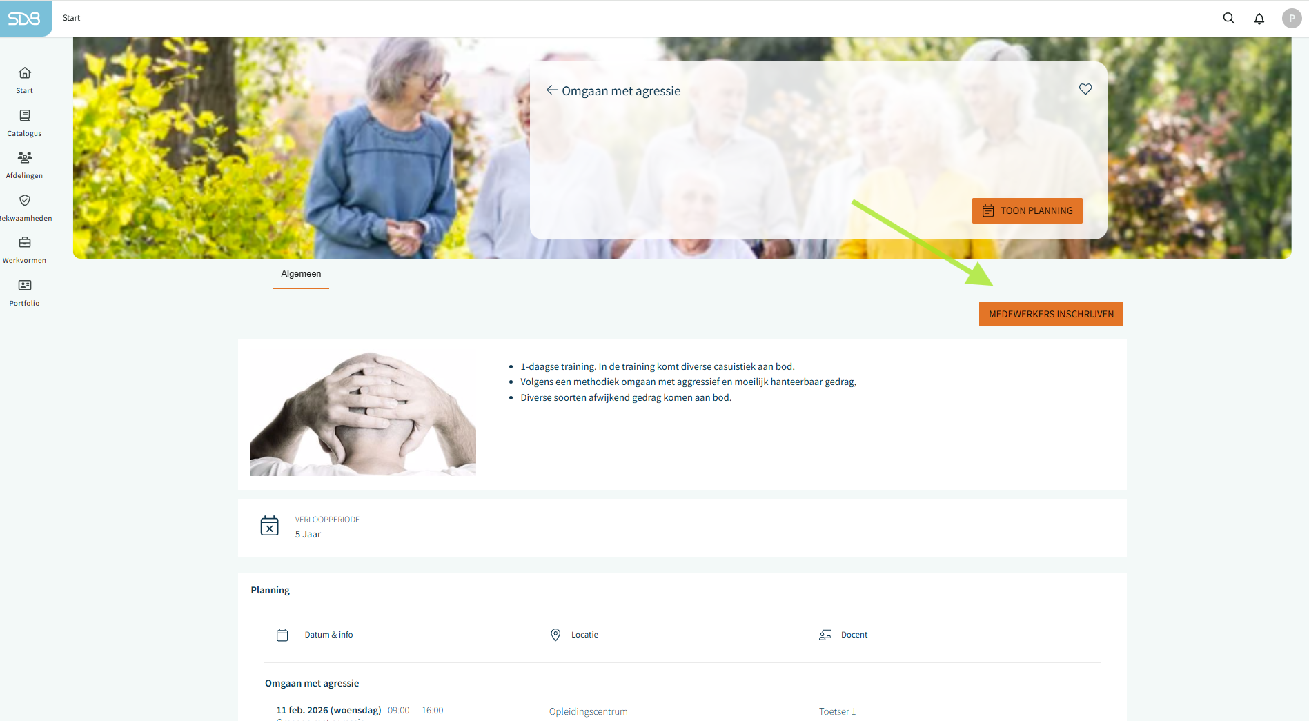 Als manager/afdelingshoofd kun je meerdere medewerkers in één keer inschrijven per rooster van een klassikale opleiding voor je eigen afdeling(en). Selecteer de opleiding in de catalogus. Klik vervolgens op de knop 'Medewerkers inschrijven'.